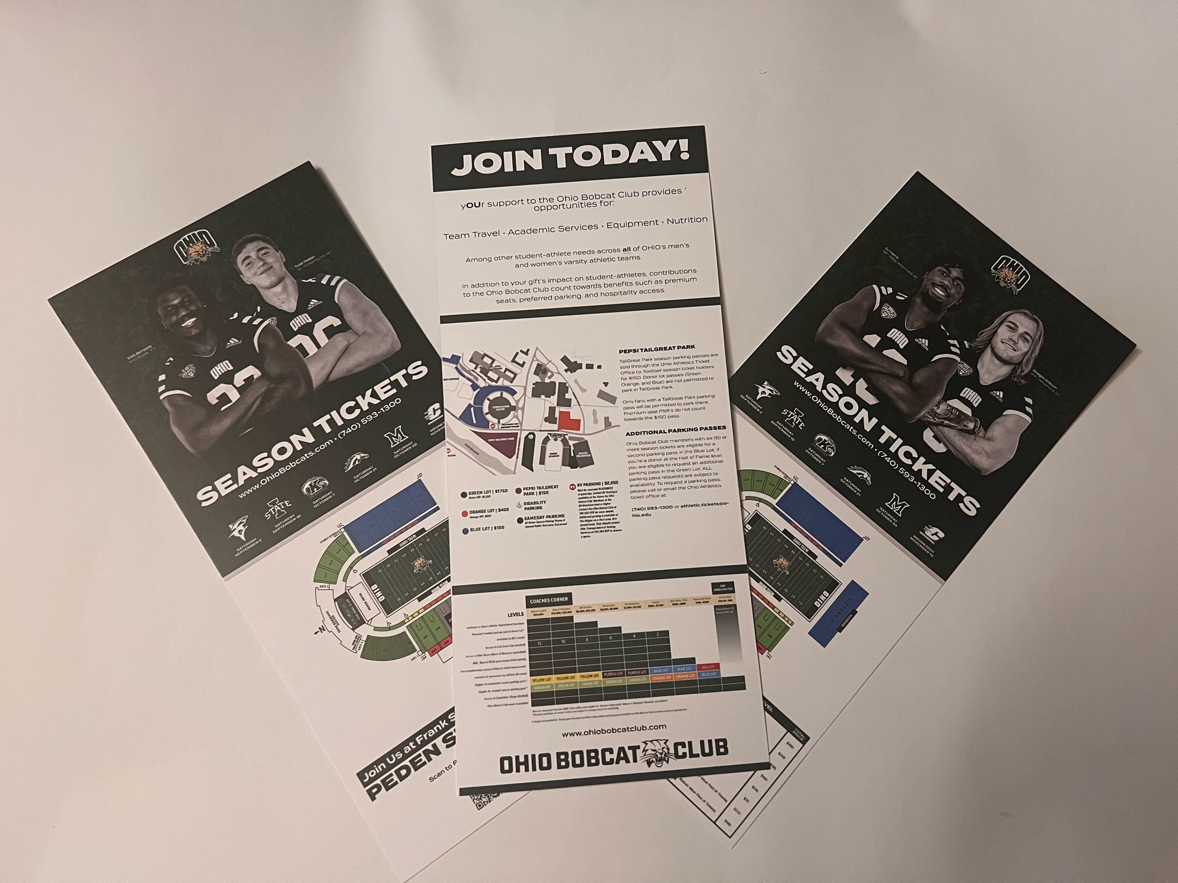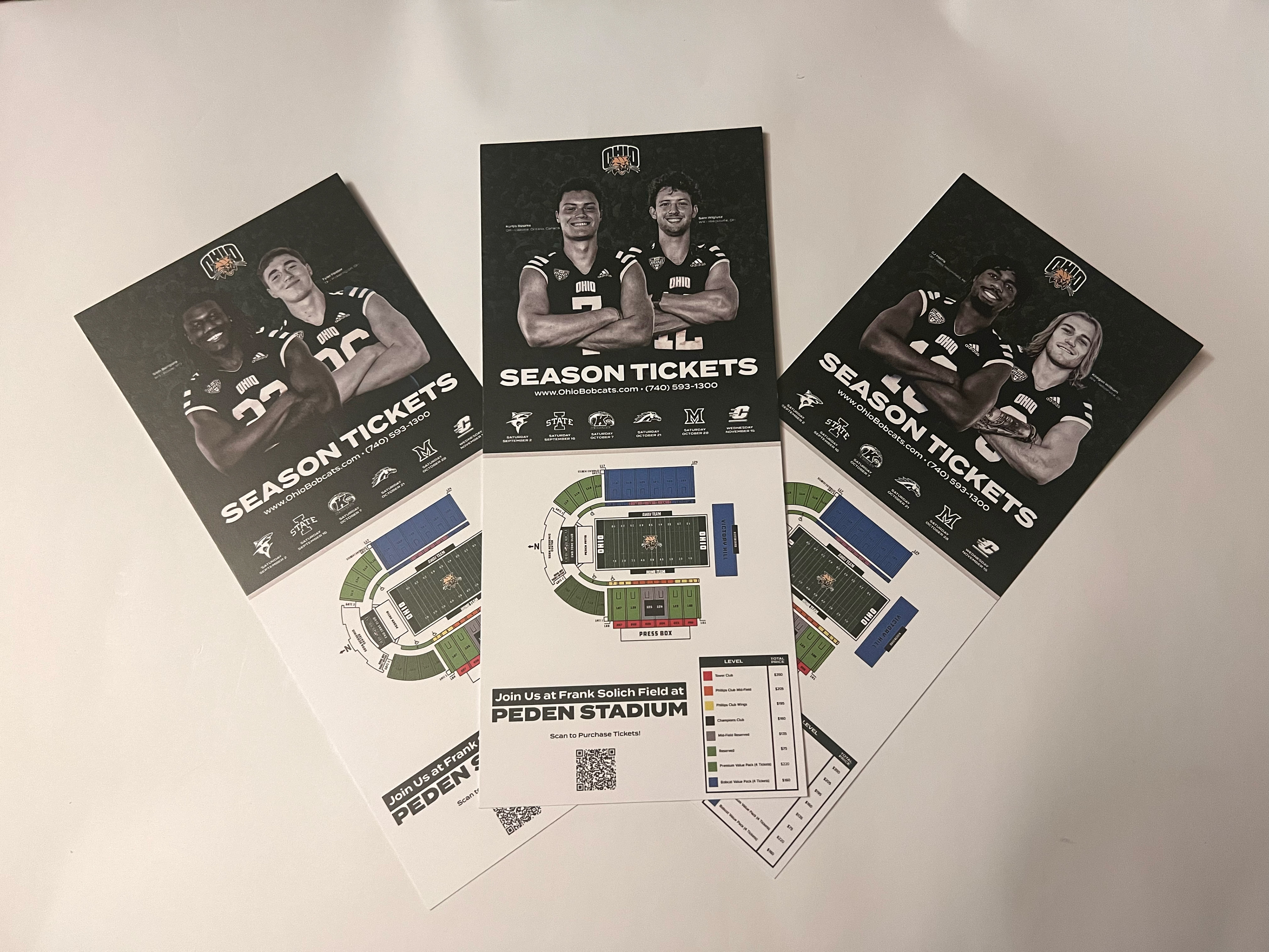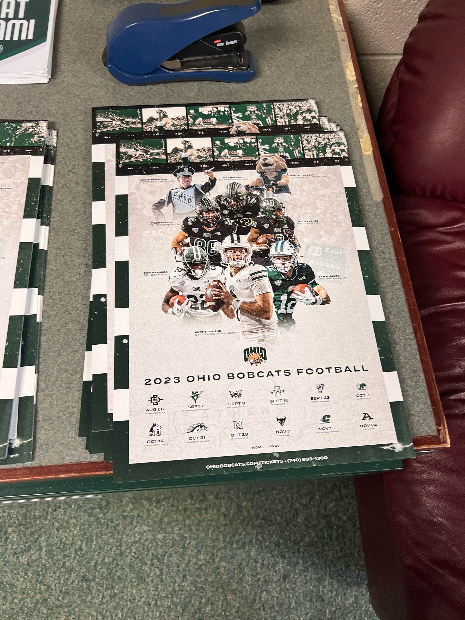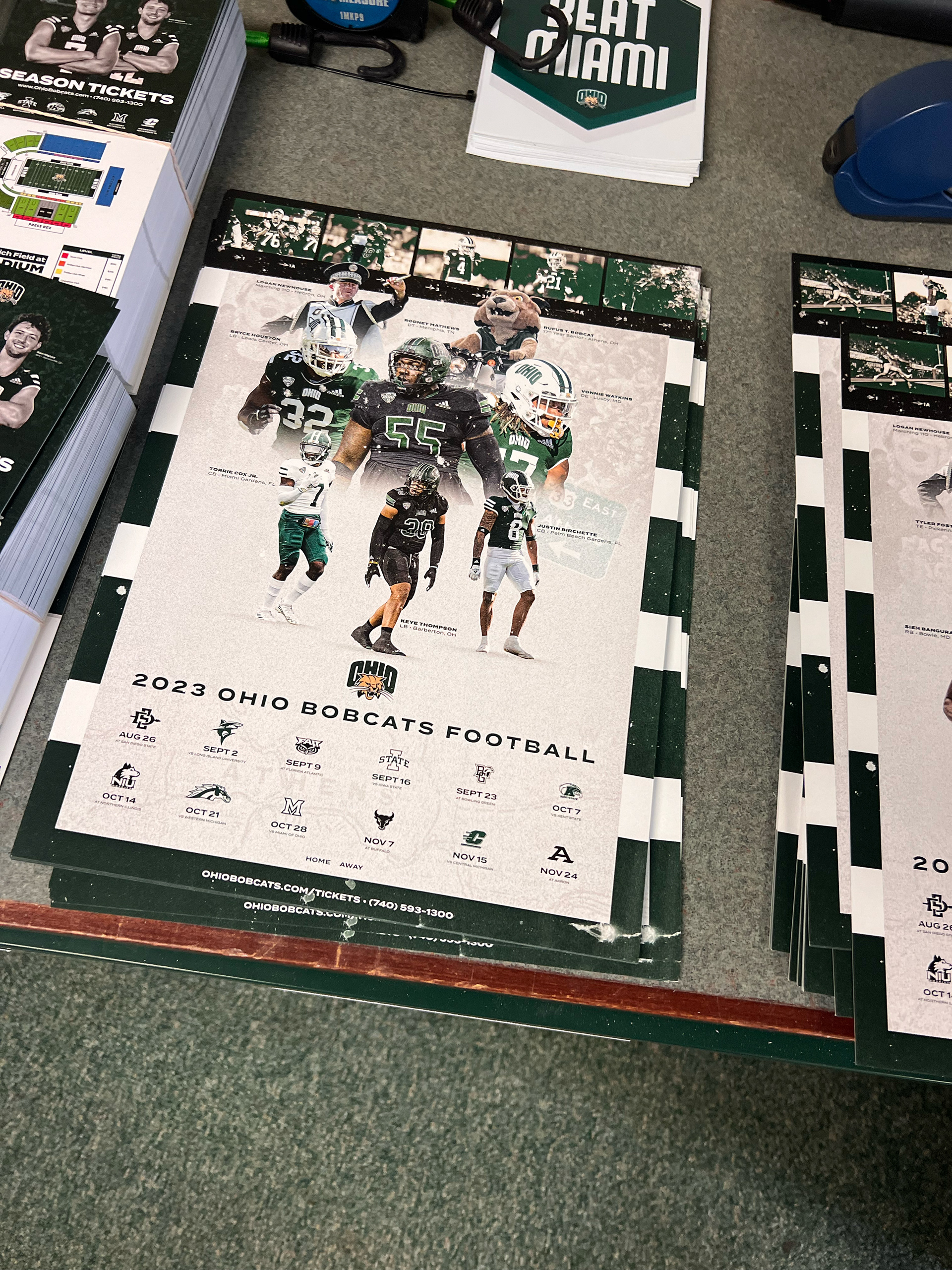 This is a collection of the various print design projects I worked on for Ohio University Athletics including their 2023 football schedule posters, schedule cards, and season ticket cards.