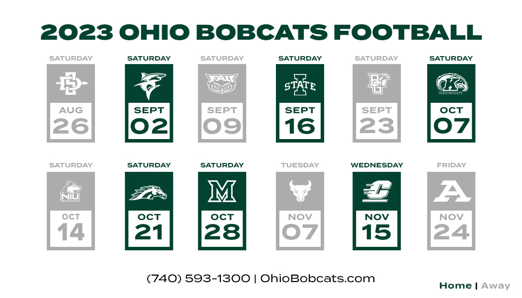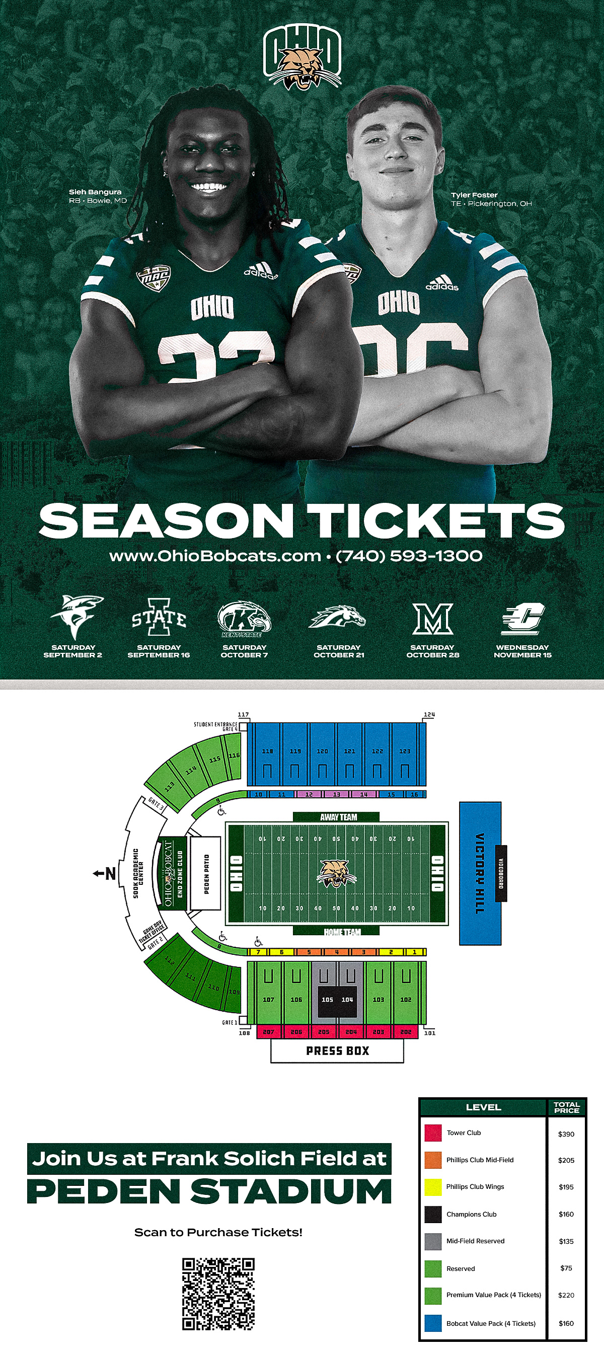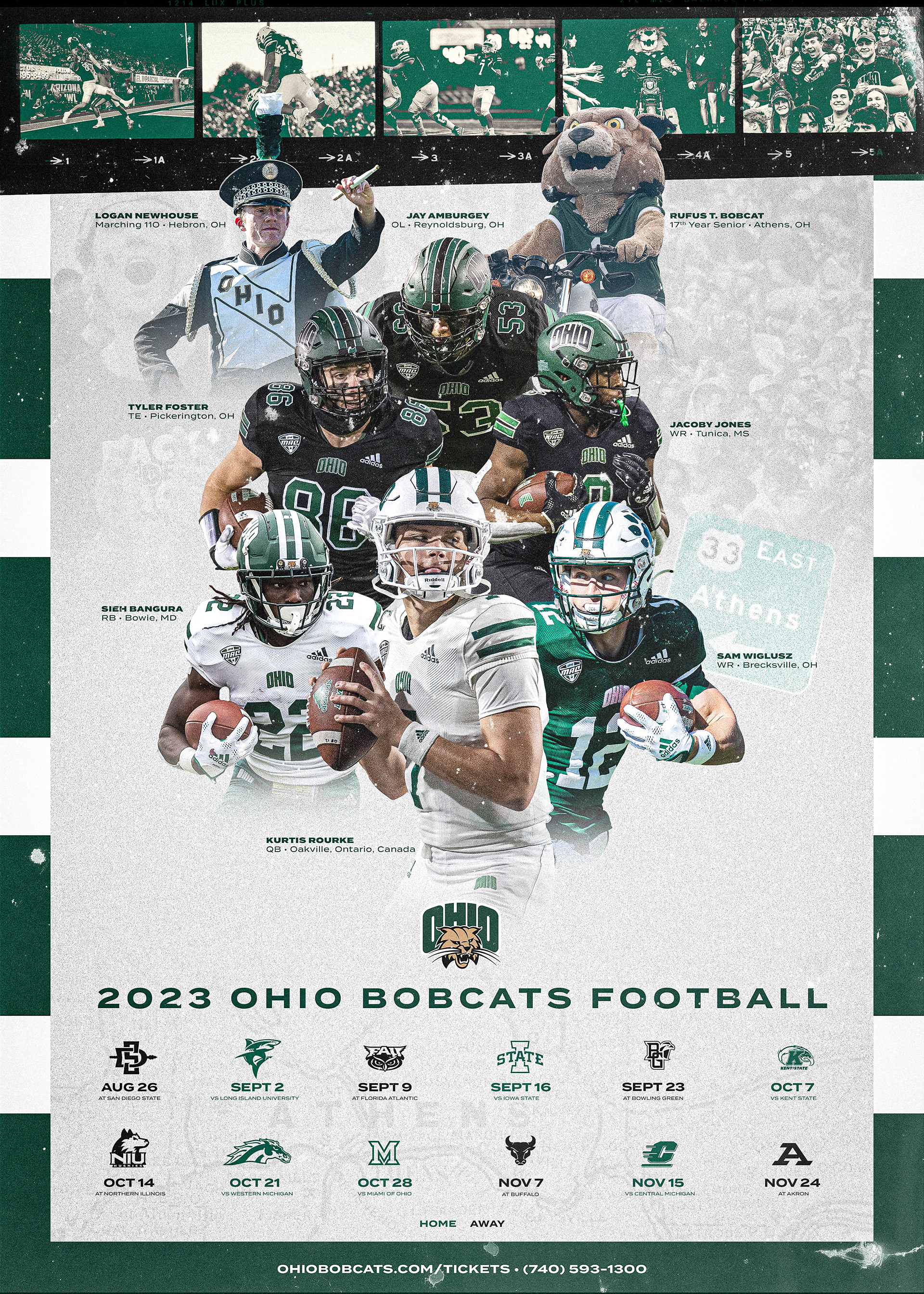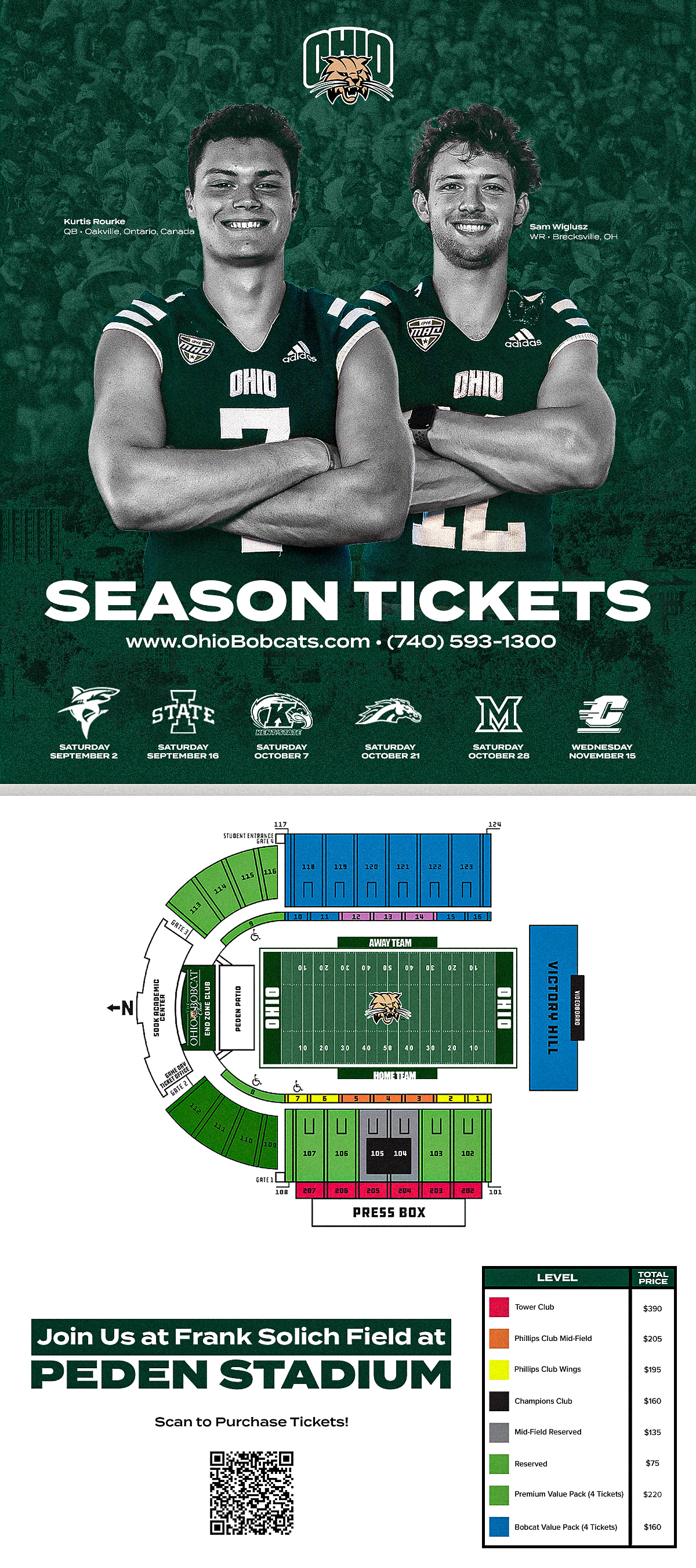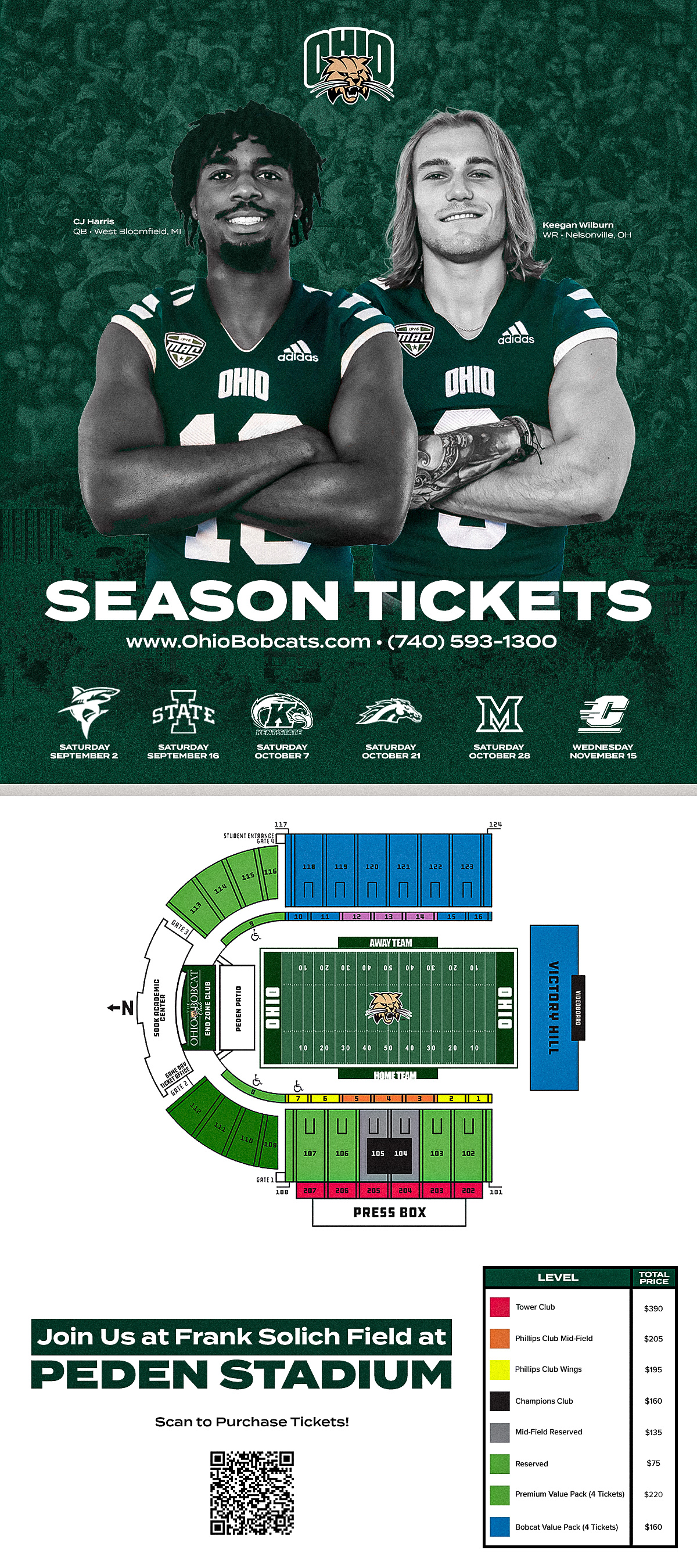 This is a collection of the various print design projects I worked on for Ohio University Athletics including their 2023 football schedule posters, schedule cards, and season ticket cards.